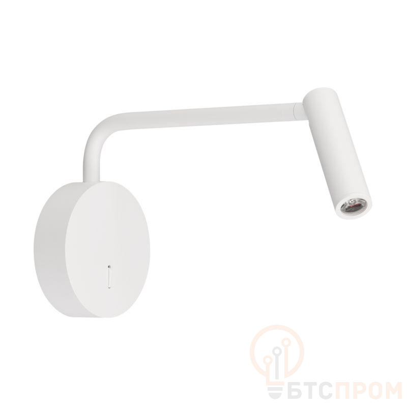 Накладной настенный светильник. Мощность 3 Вт, св. поток 180 лм, 60 лм/Вт, теплый 3000К, CRI>90, угол 20°, напряжение питания 230 В. Белый корпус из алюминия (основание, ножка, светоизлучаль в форме спота), степень защиты IP20. Размер основания O100?31 мм, размер ножки O12,6?210?50 мм, размер светоизлучателя O25?100 мм. Драйвер встроенный (700 мА, 2,5-4,5 В), пульсация <1%