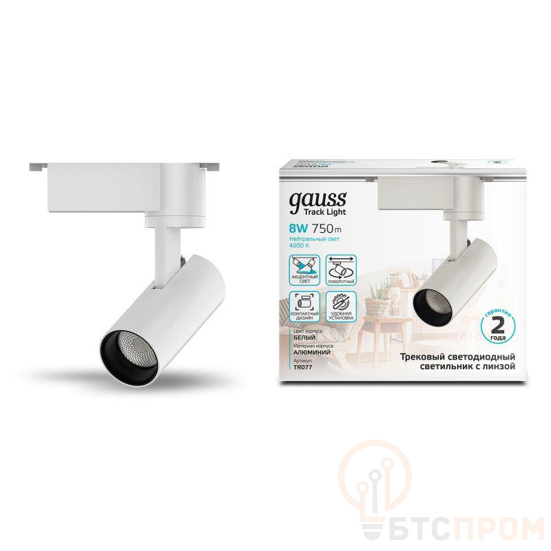 Светильник светодиодный трековый Track 8Вт 4000К IP20 750лм 180-240В ДПО угол 36град. цилиндр 1ф бел. GAUSS TR077