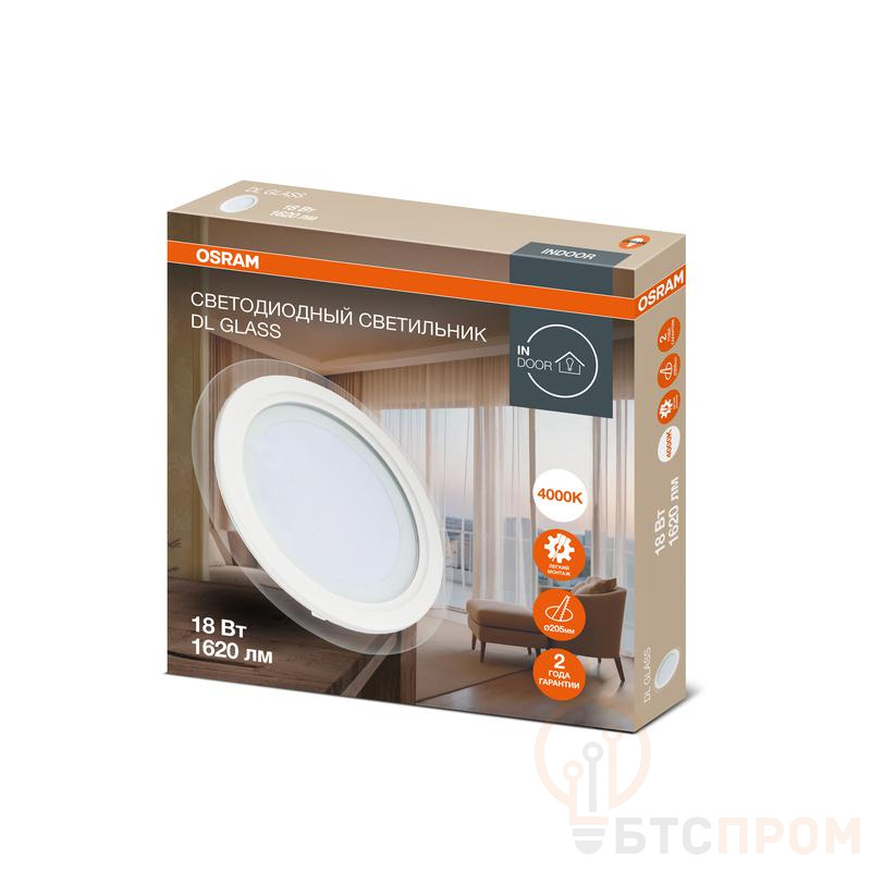 Светодиодный встраиваемый светильник Downlight DL GLASS от OSRAM — это современное и стильное решение для организации основного или акцентного освещения. Модель 840 WT мощностью 18 Вт обеспечивает комфортный нейтрально-белый свет с цветовой температурой 4000K и высокой светоотдачей 1620 лм, что создает эффективную и приятную глазу атмосферу без искажения цветов.