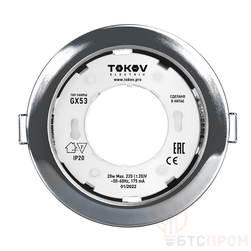 Светильник GX 53-CH-1 106х48мм хром металл+пластик TOKOV ELECTRIC — точечный светильник с хромированным покрытием. Цоколь GX53. Для натяжных и подвесных потолков. Угол рассеивания 120°.