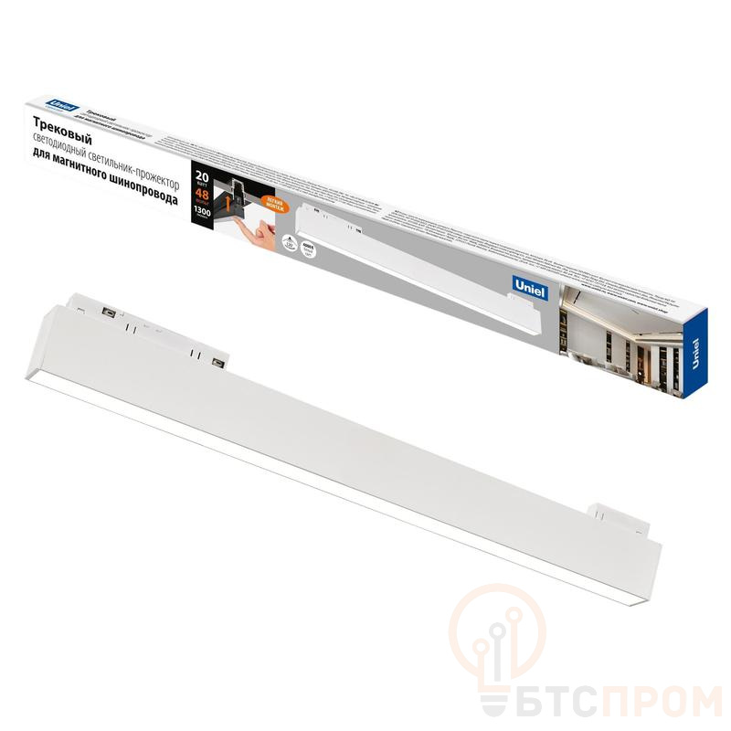 Светильник-прожектор светодиодный трековый ULB-M70-20W/4000K/35 WHITE 4000К 2000лм линейный для магнитн. шинопровода бел. Uniel UL-00008745
