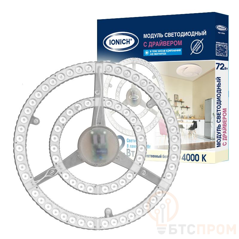 Модуль светодиодный высокой мощности для декоративных светильников 72Вт 7000лм 230В 4000К d320х25мм IP20 IONICH 2084 — это один из самых мощных модулей в линейке. Диаметр 320 мм и световой поток 7000 лм предназначены для освещения очень больших помещений: гипермаркеты, выставочные залы, спортивные комплексы. Нейтральный белый свет (4000К).