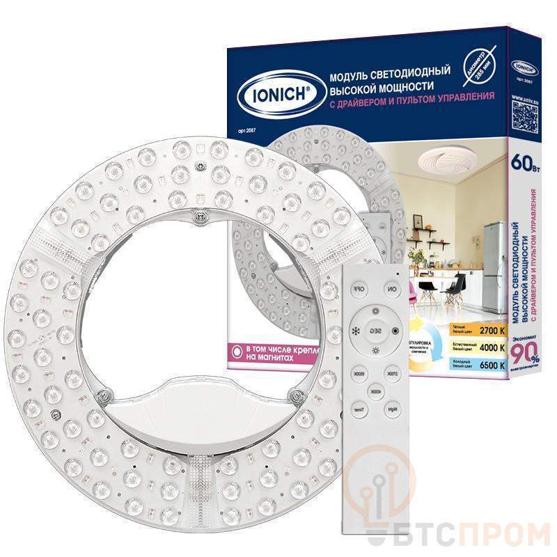 Модуль светодиодный высокой мощности с пультом ДУ для декоративных светильников 60Вт 230В 3000-6500К d285мм диммир. IP20 IONICH 2087 — это мощная версия умного модуля с регулируемой цветовой температурой. Диаметр 285 мм. Подходит для больших помещений, где требуется гибкое и яркое освещение.