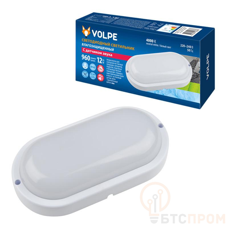 Светильник светодиодный ULW-Q215 12W/4000K Sensor IP65 White Овал 12Вт 4000К IP65 960лм промышленный накладной влагозащ. опал. рассеив. с датчиком звука и освещенности бел. Volpe UL-00004068