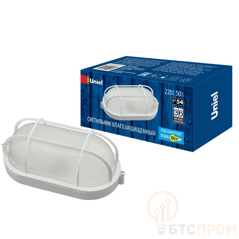 Светильник UWL-O02 100W/E27 IP54 White Овал 100Вт E27 IP54 промышленный накладной влагозащ. рассеив. призма решетка под лампу E27 Uniel UL-00006774