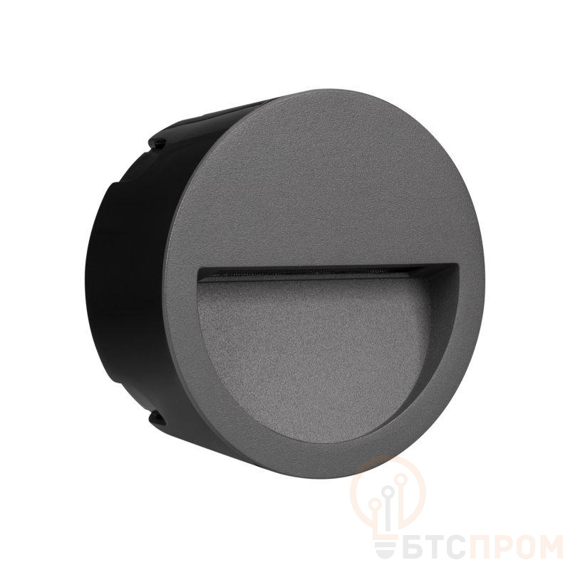 Светодиодный встраиваемый круглый светильник для стен, лестниц, 4Вт. Цвет ТЕПЛЫЙ БЕЛЫЙ 3000K, св.поток 220лм, CRI(Ra)>80, угол 65°, асимметричный свет. Размер Ф115x37мм (закладная часть O109x55мм). Влагозащищенный корпус IP65, алюминий серого цвета. Питание AC230V, 4Вт, встроенный драйвер.