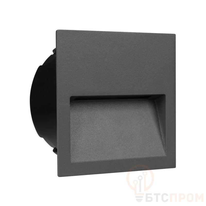 Светодиодный встраиваемый квадратный светильник для стен, лестниц, 4Вт. Цвет ТЕПЛЫЙ БЕЛЫЙ 3000K, св.поток 220лм, CRI(Ra)>80, угол 70°, асимметричный свет. Размер 115x115x37мм (закладная часть 109x107x55мм). Влагозащищенный корпус IP65, алюминий серого цвета. Питание AC230V, 4Вт, встроенный драйвер.