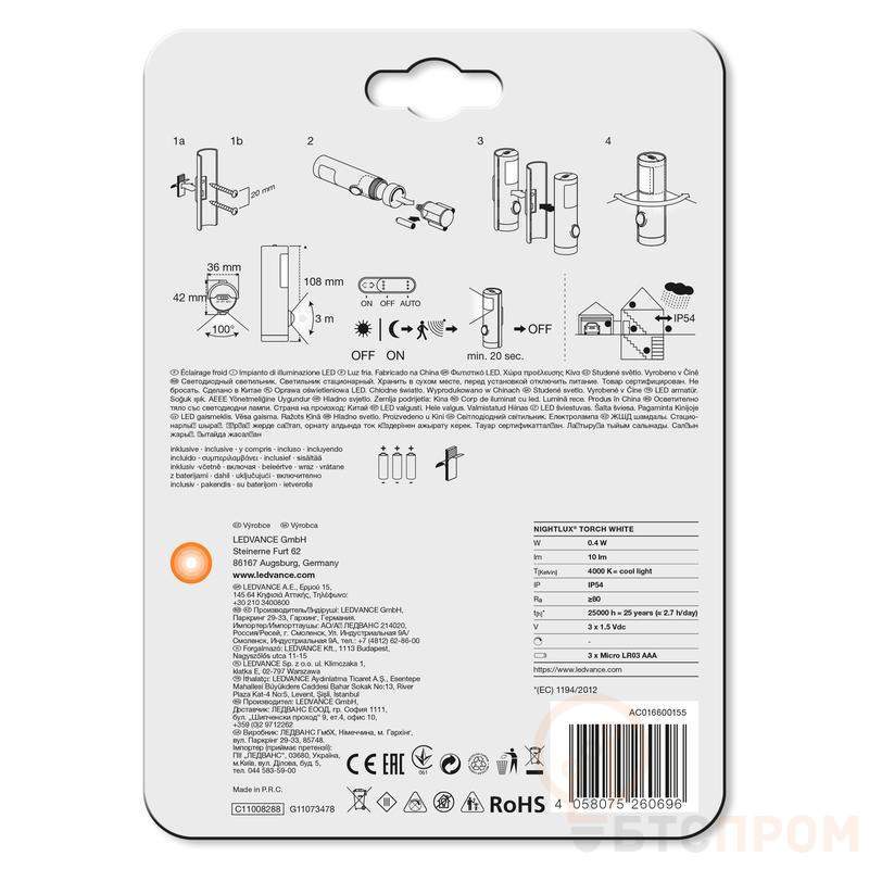 –Светильник NIGHTLUX Torch 0.35Вт 4000К 10лм IP54 3х1.5В LR03 с сенсором бел. LEDVANCE 4058075260696