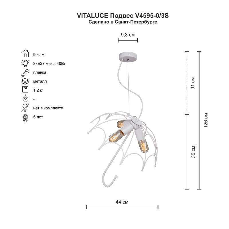 Люстра подвесная Vitaluce V4595-0/3S на три лампы под цоколь Е27 в стиле лофт будет прекрасным дополнением для любого интерьера. Люстра на потолок может украсить не только вашу гостиную, столовую или спальню, он также идеально впишется в лофт пространства, кафе, рестораны и другие общественный места. Подвесная люстра изготовлена из металлического каркаса и подвесок. Цвет арматуры - белый матовый. Возможна установка светодиодных, энергосберегающих, филаментных или ламп накаливания. Площадь освещения при использовании ламп накаливания составляет 9 м2. При использовании светодиодной лампы мощностью до 8 Вт площадь освещения может быть увеличена до 15 м2. Люстра имеет возможность крепления на планку, что делает ее универсальной для монтажа к любым видам потолков. Обращаем ваше внимание, лампы в комплект не входят. Параметры изделия: высота - 126 см, диаметр - 44 см. Размеры потолочной чаши: высота - 2,5 см, диаметр - 9,8 см. Длина изделия регулируется. Прилагается инструкция по сборке и установке.