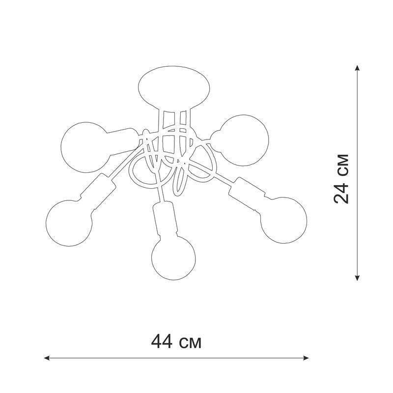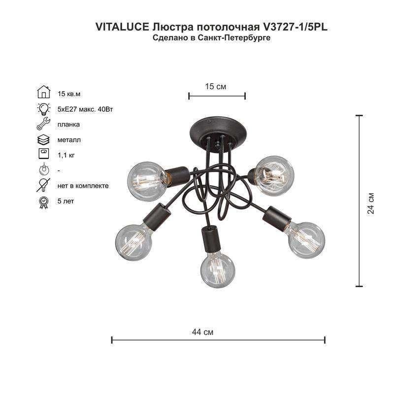 Люстра потолочная Vitaluce V3727-1/5PL на пять ламп под цоколь Е27 в стиле лофт будет прекрасным дополнением для любого интерьера. Люстра на потолок может украсить не только вашу гостиную, столовую или спальню, он также идеально впишется в лофт пространства, кафе, рестораны и другие общественный места. Потолочная люстра изготовлена из металлического каркаса. Цвет арматуры - черный матовый. Возможна установка светодиодных, энергосберегающих, филаментных или ламп накаливания. Площадь освещения при использовании ламп накаливания составляет 15 м2. При использовании светодиодной лампы мощностью до 8 Вт площадь освещения может быть увеличена до 25 м2. Люстра имеет возможность крепления на планку, что делает ее универсальной для монтажа к любым видам потолков. Обращаем ваше внимание, лампы в комплект не входят. Параметры изделия: высота - 24 см, диаметр - 44 см. Размеры потолочной чаши: высота - 3 см, диаметр - 15 см. Прилагается инструкция по сборке и установке.