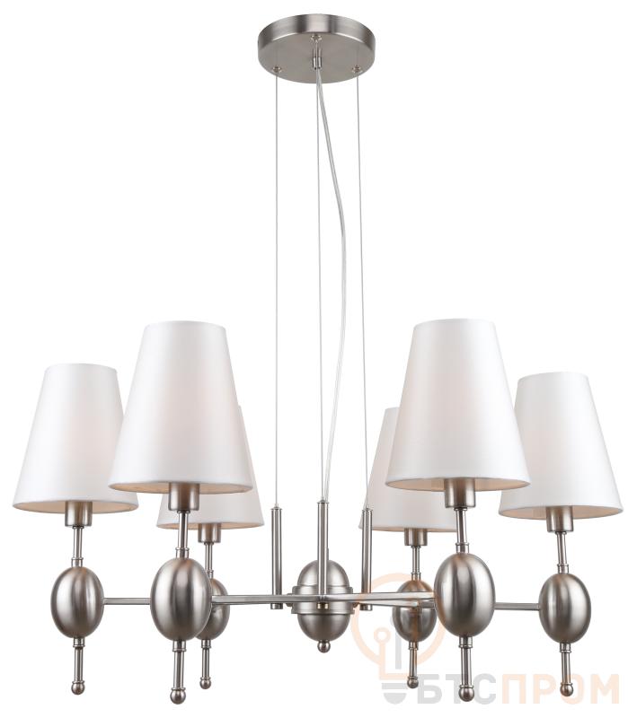 Дизайнерские классические люстры Rivoli Annabelle под 6 ламп (арт. 2064-306) и под 8 ламп (арт. 2064-308). В коллекцию входит также бра Rivoli Annabelle – арт. 2064-401. Отличительные особенности коллекции – крупные декоративные элементы овальной формы, белые тканевые плафоны традиционной формы, минималистичная арматура с прямыми линиями. Подвесные люстры Annabelle созданы итальянским брендом Rivoli. Их высоту можно отрегулировать при монтаже люстры на потолок. Данная люстра подвесная с 6 плафонами-абажурами освещает площадь 18 м2 и отлично подходит в качестве люстры в гостиную, люстры в спальню, люстры в загородный дом. Цвет люстры – модный никель сатин. Для стиля современная классика эта люстра на потолок – настоящая находка!