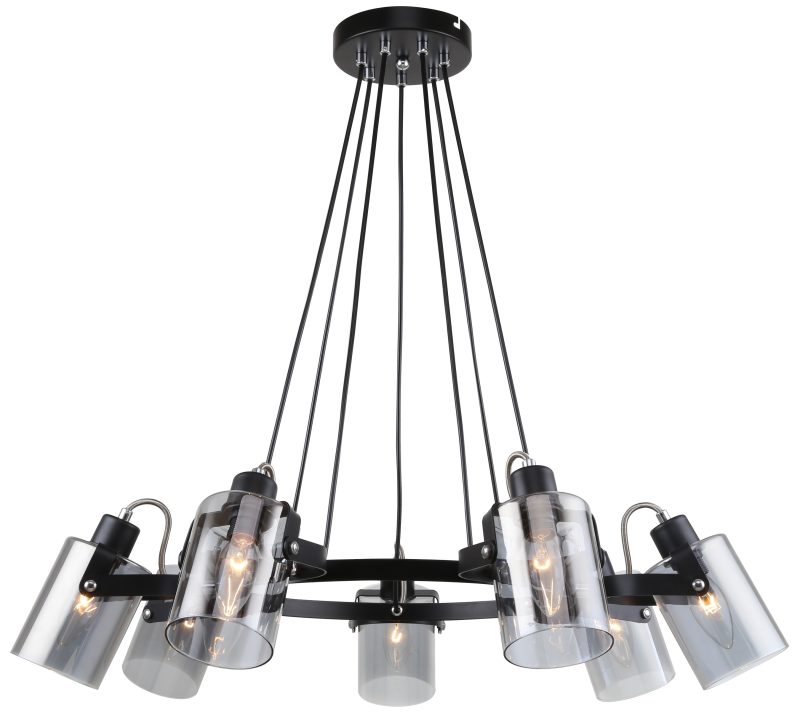 Rivoli Davida - итальянская коллекция современных люстр из металла и стекла. Такие люстры помогут создать эффектный интерьер в стиле лофт, кантри. Данная модель (арт. 5099-307) имеет 7 стеклянных плафонов под лампы Е14 40 Вт. Высота подвеса люстры на потолок Davida регулируется. Арматура люстры Rivoli Davida окрашена в черный цвет гальваническим методом, корпус не выцветет со временем, на нем не возникнут царапины и сколы. Люстры Davida выбирают в качестве основного светильника в гостиную или на кухню, в загородный дом. Люстра подвесная на тросах Rivoli Davida входит в единую коллекцию с подвесной люстрой на 5 ламп (5099-305) и бра (5099-401). Посмотрите фото этих моделей, чтобы купить хорошие бра и люстры в спальню, гостиную, прихожую, на кухню.