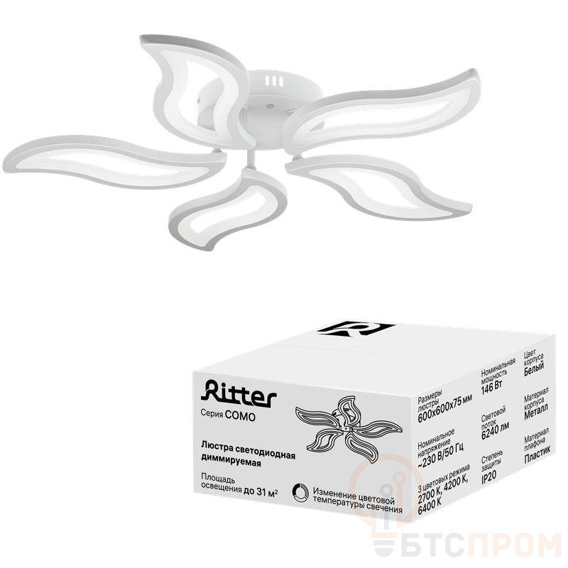 Люстра потолочная светодиодная диммируемая COMO 600х600х75мм 146Вт 2700К/4200К/6400К 31кв.м бел. Ritter 51934 2