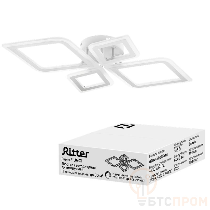Люстра потолочная светодиодная диммируемая Ritter 52141 3 FIUGGI — это прямоугольная модель размером 670x450x75 мм и мощностью 146Вт. Освещаемая площадь до 30 кв.м делает ее подходящей для больших гостиных или офисов. Три режима цветовой температуры и диммирование.