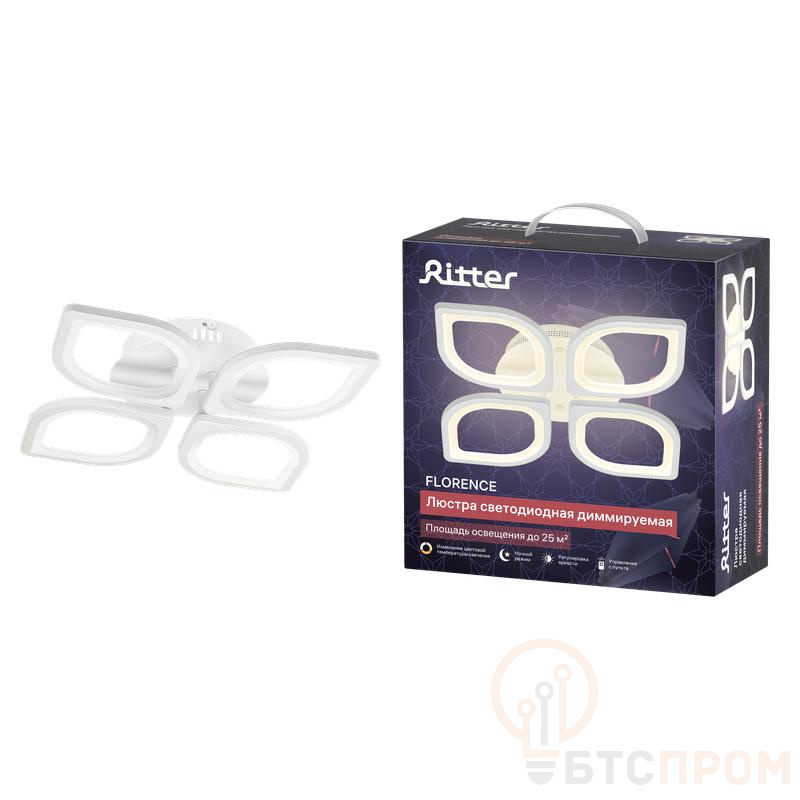 Люстра потолочная светодиодная диммируемая Ritter 52015 3 FLORENCE с ДУ — это компактная модель 370x370x80 мм с мощностью 86Вт. Освещает площадь до 25 кв.м. Пульт ДУ позволяет управлять тремя цветовыми температурами (2700K/4200K/6400K). Белый корпус универсален.