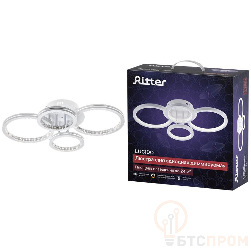 Люстра потолочная светодиодная диммируемая Ritter 51647 1 LUCIDO с ДУ имеет размеры 565x385x130 мм и мощность 72Вт. Освещает площадь до 24 кв.м. Три цветовые температуры. Бело-серебристый корпус.