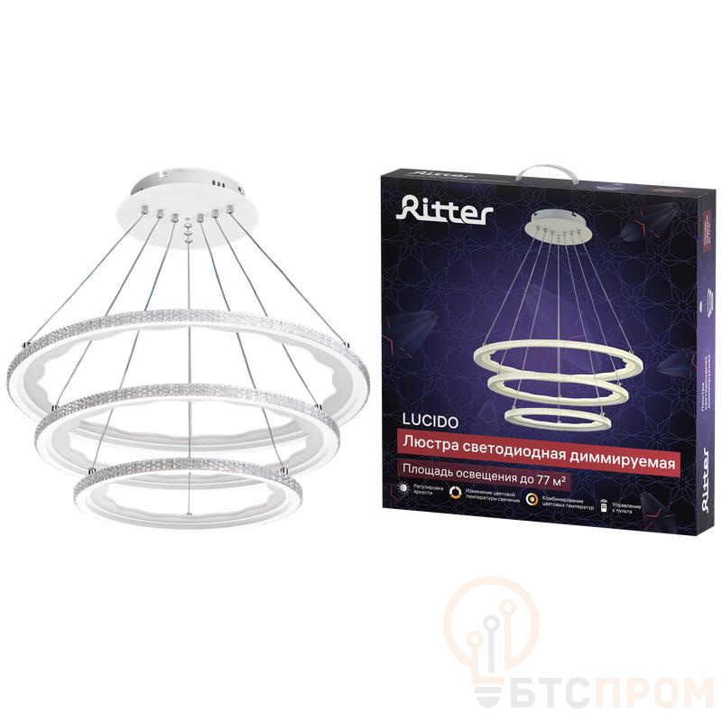 Люстра потолочная светодиодная диммируемая Ritter 51645 7 LUCIDO с ДУ — это масштабная модель 600x1000 мм с рекордной мощностью 254Вт. Освещает площадь до 77 кв.м. Комбинированные режимы 2700K+6400K и другие. Белый корпус.
