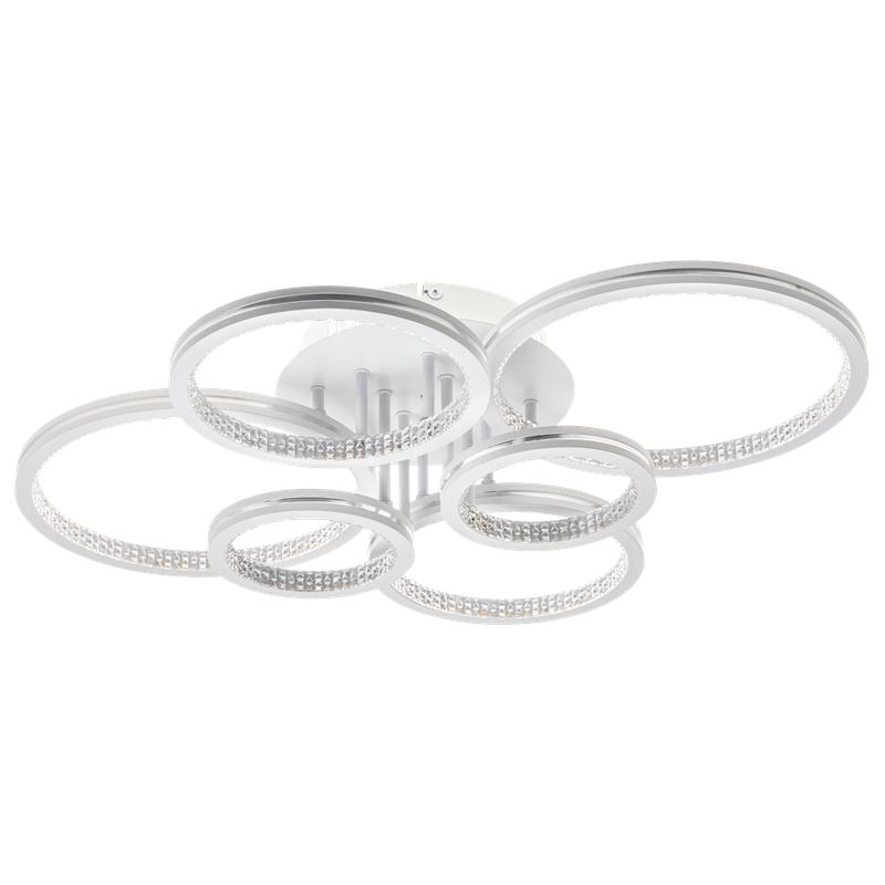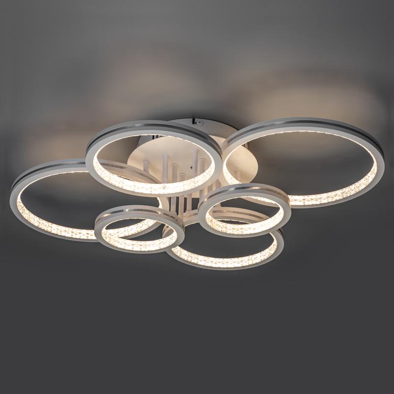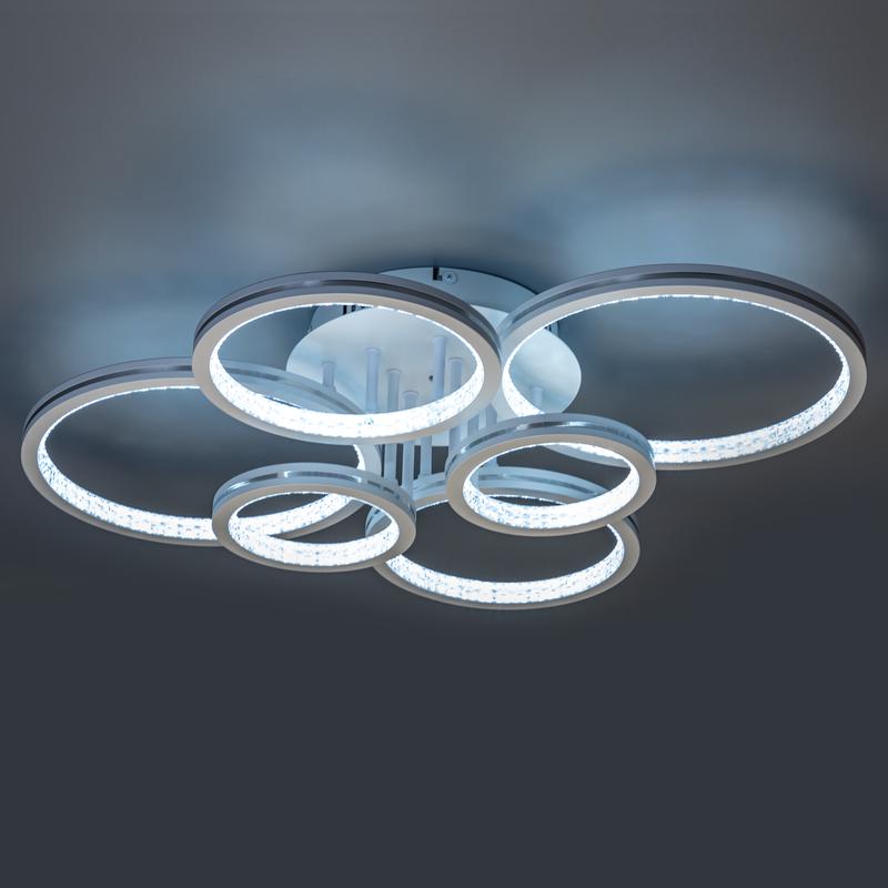 Люстра потолочная светодиодная диммируемая Ritter 51648 8 LUCIDO с ДУ размером 735x575x170 мм и мощностью 126Вт. Освещает площадь до 41 кв.м. Три цветовые температуры. Бело-серебристый корпус.