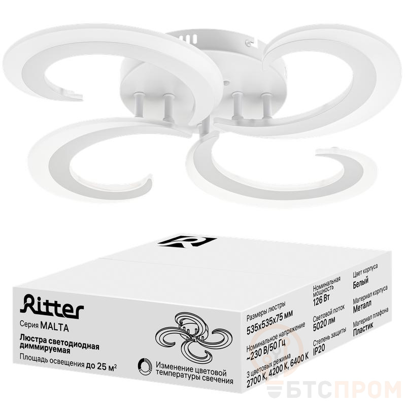 Люстра потолочная светодиодная диммируемая Ritter 52117 8 MALTA имеет квадратную форму 535x535x75 мм и мощность 126Вт. Освещает площадь до 25 кв.м. Три цветовые температуры (2700K/4200K/6400K). Белый корпус.