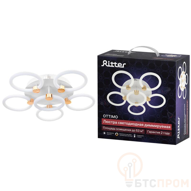 Люстра потолочная светодиодная диммируемая OTTIMO с ДУ 3 режима 610х130мм 124Вт 2700К/4200К/6400К 53кв.м бел./зол. Ritter 51639 6
