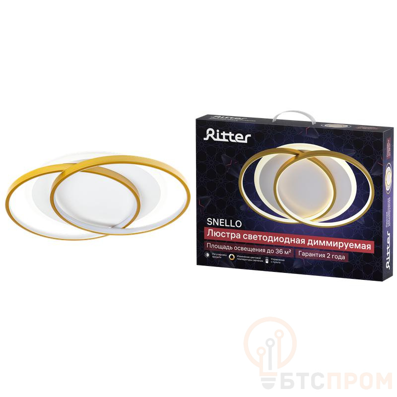 Люстра потолочная светодиодная диммируемая Ritter 51624 2 SNELLO с ДУ размером 530x385x75 мм и мощностью 100Вт. Освещает площадь до 36 кв.м. Три цветовые температуры. Золотой корпус.