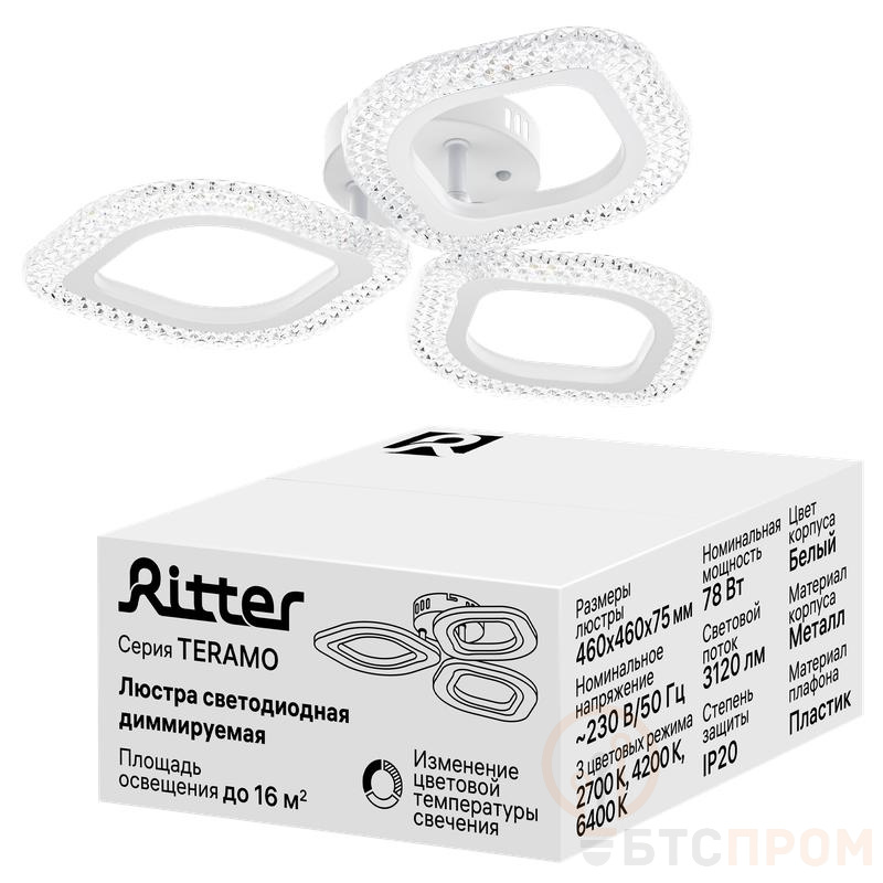 Люстра потолочная светодиодная диммируемая Ritter 52174 1 TERAMO размером 460x460x75 мм и мощностью 78Вт. Освещает площадь до 16 кв.м. Три цветовые температуры. Белый корпус.