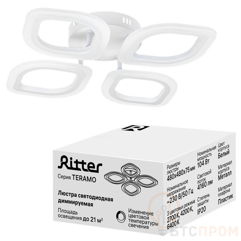 Люстра потолочная светодиодная диммируемая Ritter 52183 3 TERAMO размером 480x480x75 мм и мощностью 104Вт. Освещает площадь до 21 кв.м. Три цветовые температуры. Белый корпус.