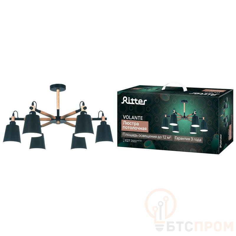 Люстра Ritter 52448 9 VOLANTE — это потолочная люстра. Модель имеет размеры 780x430 мм и рассчитана на 6 лампочек E27. Корпус сочетает черный металл и дерево. Люстра предназначена для освещения помещений площадью до 12 кв.м. Ее дизайн сочетает в себе индустриальные и натуральные мотивы, создавая уникальную эстетику.