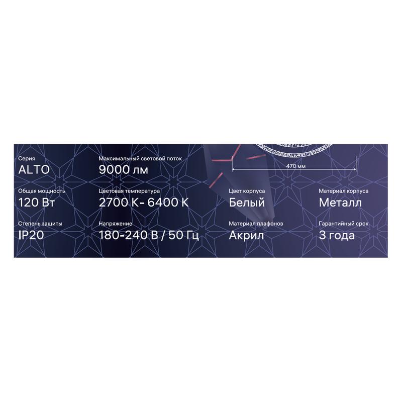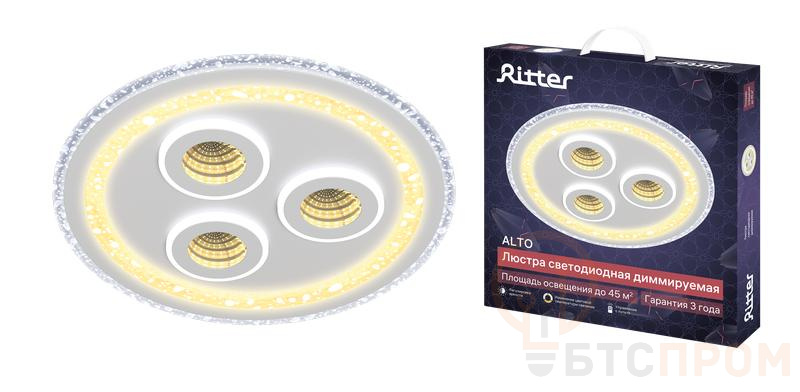 Люстра светодиодная Ritter 52307 3 ALTO мощностью 120Вт и размером 470x50 мм. Освещает площадь до 45 кв.м. Управление с пульта ДУ, три режима, диммирование. Белый корпус.