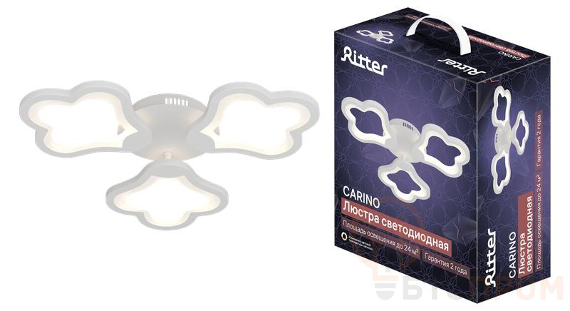 Люстра светодиодная Ritter 52049 2 CARINO мощностью 48Вт и размером 435x410x67 мм. Три цветовые температуры (2700K/4200K/6500K). Освещает площадь до 24 кв.м. Белый корпус.