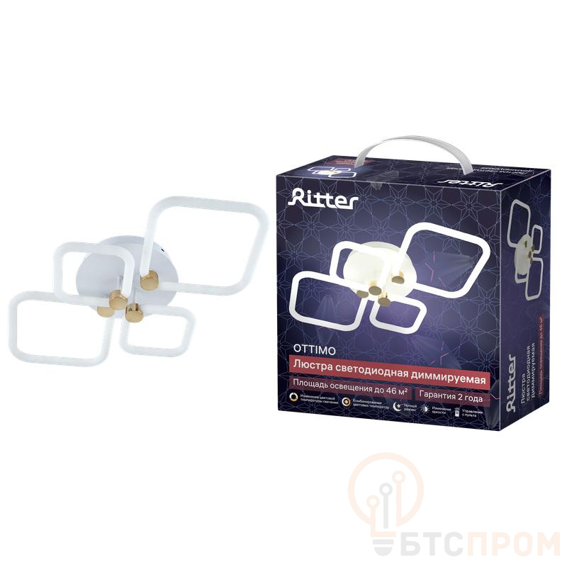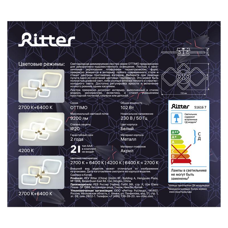 Люстра светодиодная OTTIMO Алиса 102Вт 2700К+6400К/4200К/6400К+2700К 720х425х130мм 46кв.м ДУ диммир. бел./зел. Ritter 51616 7