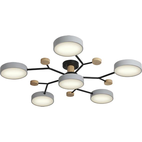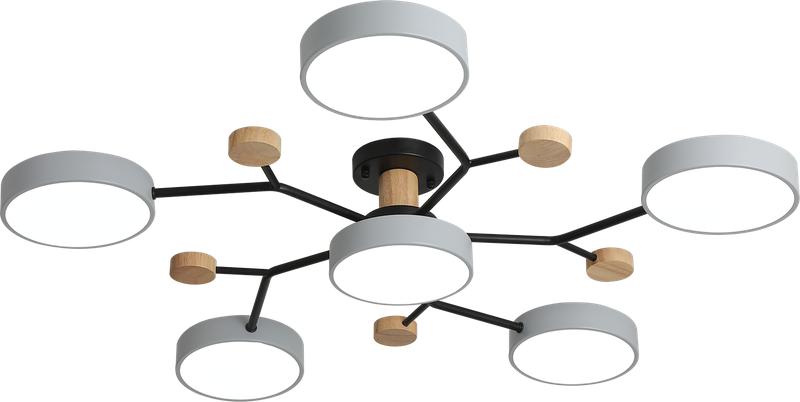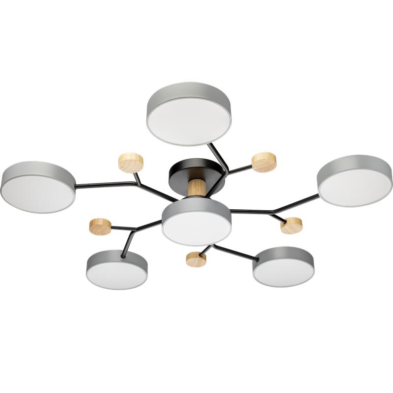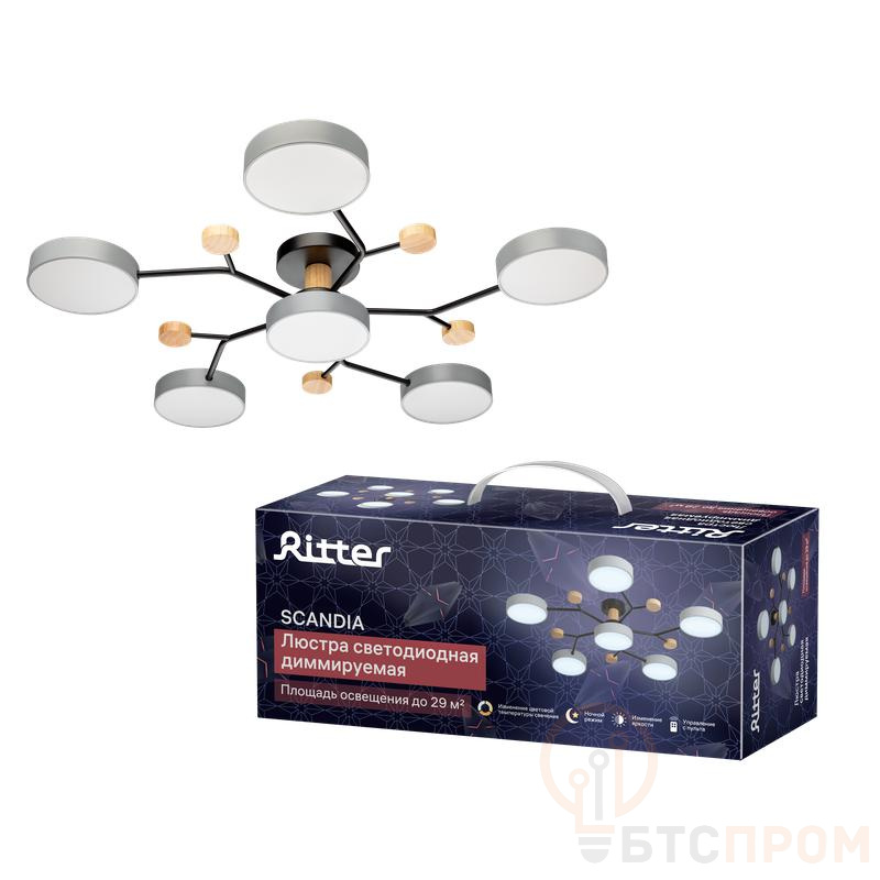 Люстра светодиодная Ritter 52079 5 SCANDIA мощностью 84Вт и размером 800x800x170 мм. Освещает площадь до 30 кв.м. Пульт ДУ, три режима, диммирование. Серо-черно-деревянный корпус.