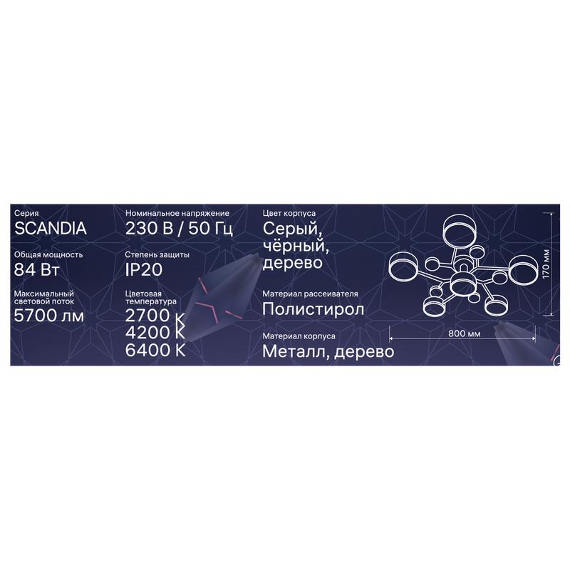 Люстра светодиодная SCANDIA 84Вт 800х800х170мм 30кв.м потолочная ДУ 3 режима диммир. сер./черн./дерево Ritter 52079 5