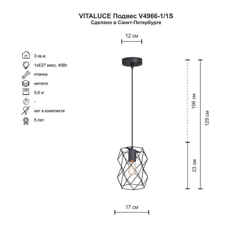 Подвес V4966-1/1S VITALUCE на 1 лампу мощностью 40 Вт привлекательного и вместе с тем грубоватого стиля лофт прекрасно впишется в помещение с любым другим стилевым наполнением. Цвет арматуры - черный, тип крепления - планка.При использовании светодиодной лампы мощностью до 8 Вт площадь освещения до 7 м2
