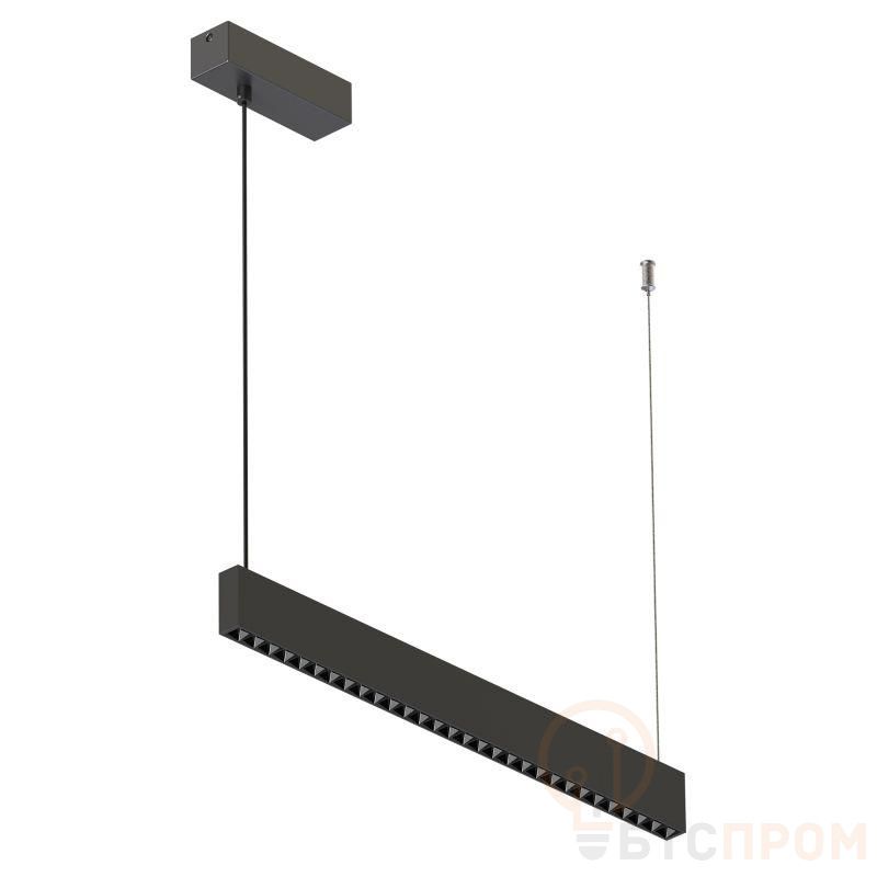 Подвесной линейный светильник. Мощность 24 Вт, св. поток 1440 лм, 60 лм/Вт, дневной 4000 K, CRI>90, угол 38 + 100°, напряжение питания 230 В. Черный линейный корпус из алюминия, экран пластик, степень защиты IP20. Размер: длина 578 мм, ширина 24 мм, высота 60 мм. Монтаж подвесной. Габариты чаши (накладная): длина 140 мм, ширина 48 мм, высота 42 мм. Драйвер 24-42 В, 700 мА, пульсация <1%.