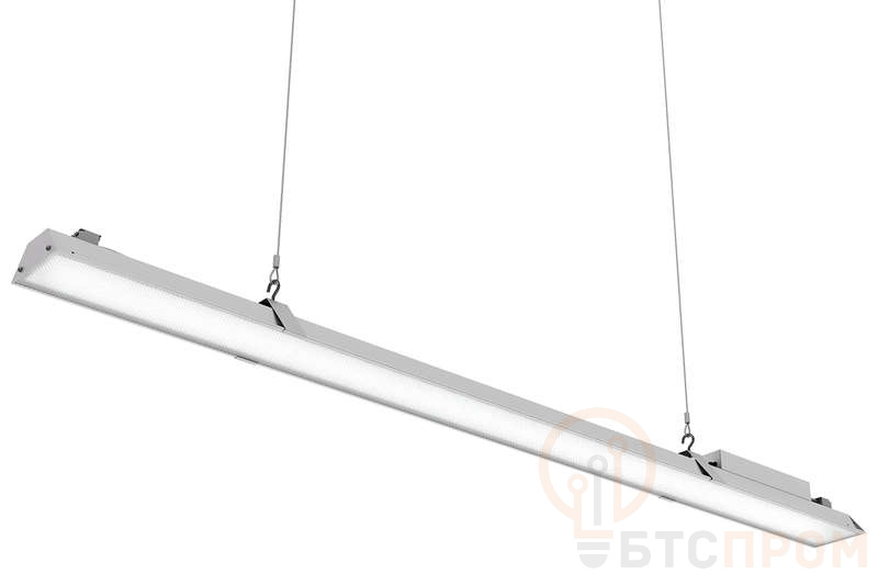 Светодиодные линейные светильники разработаны специально для освещения торговых залов гипермаркетов. Удобный регулируемый крепеж позволяет осуществлять подвесной монтаж. Важной особенностью является возможность устанавливать данные светильники в одну продолжительную однородную линию при помощи удобного торцевого соединения. Максимальное количество светильников, соединённых между собой в линию не должно превышать двадцать штук. Корпус белого цвета. Материал корпуса – сталь. Материал рассеивателя – ПММА.