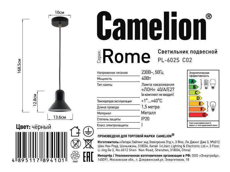 Светильники стационарные подвесные для использования с лампами накаливания предназначены для подсветки интерьеров квартир, загородных коттеджей, кафе и ресторанов. PL-602S C02 черный , серия Rome , размер 1685х136х136 мм, источник света - ЛОН,LED,КЛЛ тип лампы - 40/A/E27, патрон - E27, мощность 40Вт, ~230 В, 50 Гц. диаметр металлического плафона 136 мм, высота плафона - 128 мм. Фактурная бархатистая окраска. Высота провода- подвеса ( макс.- 1550 мм) регулируется.