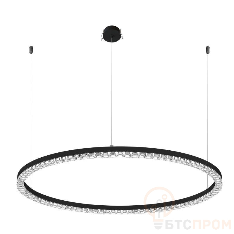 Подвесной светильник. Мощность 36 Вт, св. поток 2900 лм, 80-95 лм/Вт, теплый 3000K, CRI>90, угол 45°, напряжение питания 230 В. Чёрный круглый корпус из алюминия, экран PMMA, степень защиты IP20. Размер: диаметр 650 мм, высота 34 мм, ширина профиля 30 мм, размер чаши: диаметр 65 мм, высота 26 мм. Монтаж подвесной, длина подвеса 1200 мм, тип чаши встраиваемый, диаметр установочного отверстия чаши 60 мм. Драйвер 27-38 В, 1050 мА. Пульсация <0,3%.