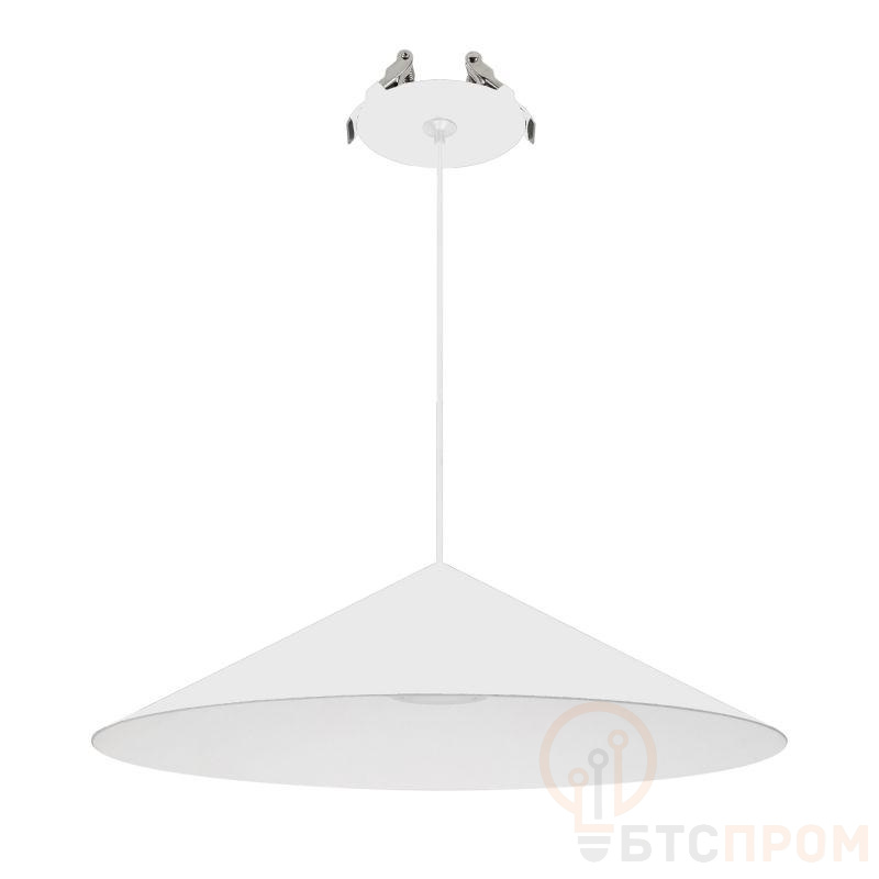 Подвесной светильник. Мощность 10 Вт, св. поток 600 лм, 60 лм/Вт, теплый 2700 K, CRI>94, угол 36°, напряжение питания 230 В. Белый корпус из алюминия в форме конуса с белой внутренней поверхностью, линза-рассеиватель из PMMA, степень защиты IP20. Размер: диаметр 300 мм, высота 80 мм. Монтаж подвесной, длина подвеса 2000 мм, регулируемая. В комплекте две чаши. Габариты чаши (встроенной) O80 х 41 мм, врезное отверстие O55 мм, габариты чаши (накладной) O110 х 25 мм. Драйвер 2,8-12В, 500мА, пульсация <1%. Управление по TRIAC.