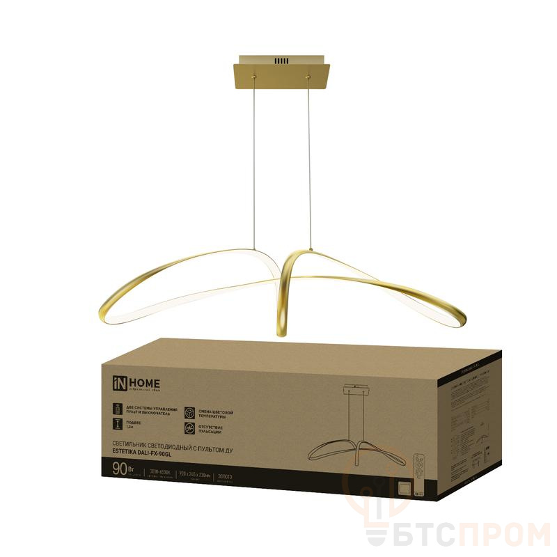 Корпус светильника выполнен в золотом цвете (IN HOME Gold) и имеет габариты 920x245x230 мм. Устройство оснащено системой дистанционного управления (ДУ) для удобного контроля и настройки. В комплект входят тросы подвеса длиной 1.2 метра для простого и надежного монтажа подвесных потолков. Светильник поддерживает протокол DALI для интегрированного управления освещением, что делает его отличным выбором для офисов, торговых залов, учебных заведений и объектов сферы услуг.