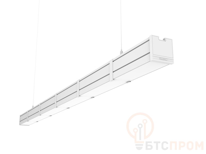 Корпус выполнен в эстетичном белом муаровом цвете RAL9003, дополнен декоративным проводом и комплектом подвесов длиной 2 метра для удобного монтажа. Высокий индекс цветопередачи CRI≥90 гарантирует точную передачу цветов окружающих объектов.