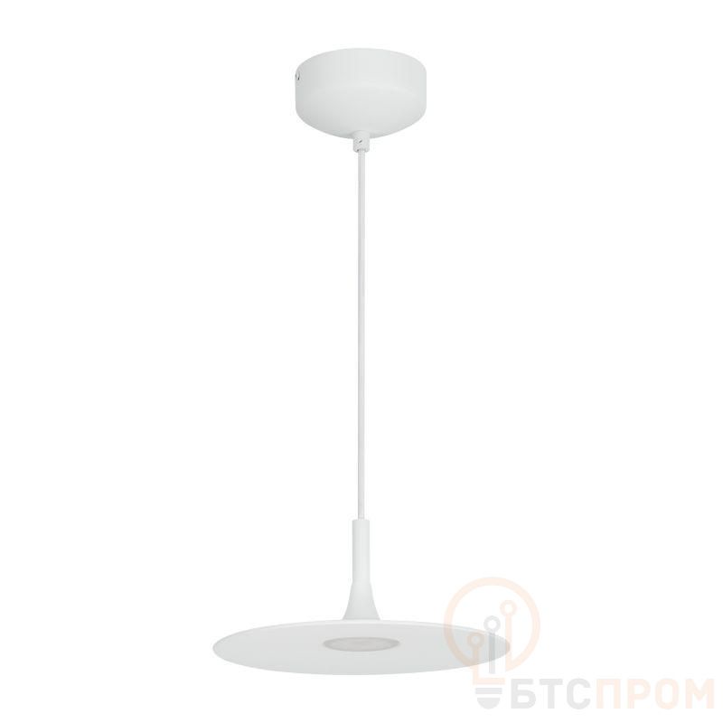Подвесной светильник. Мощность 8 Вт, св. поток 525 лм, 70 лм/Вт, теплый 3000 K, CRI>90, угол 120°, напряжение питания 230 В. Белый круглый корпус из алюминия, рассеиватель каленое матовое стекло , степень защиты IP20. Размер: диаметр 250 мм, высота основания 64 мм, общая высота 108 мм. Монтаж подвесной, длина подвеса 1500 мм, регулируемая. Габариты чаши O120x75 мм. Драйвер 14-24 В, 300 мА, пульсация <5%.