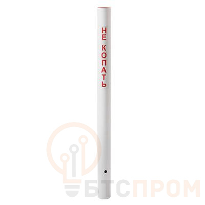 Столбик замерный кабельный изготовлен из полиэтилена. Представляет собой полую трубу высотой 1200 миллиметров, диаметром 83 мм. Поверхность белая, хорошо заметен в любое время суток. На сторонах присутствуют предупреждающие красные маркировки «Не копать» и «Кабель». Столбик оснащен красной плоской крышкой, в нижней части выполнено отверстие для анкерного крепления.