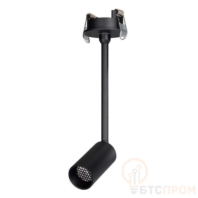 Встраиваемый поворотный светильник для потолка. Мощность 6 Вт, св. поток 410 лм, 68 лм/Вт, дневной 4000 K, CRI>90, угол 24°, напряжение питания 230 В. Черный круглый корпус из алюминия, экран PC, степень защиты IP40. Размер (OД?В) 35?70 мм, длина ножки крепления 153 мм. Монтаж встраиваемый, установочное отверстие O 55 мм. Драйвер 27-50 В, 120 мА, пульсация <5%.