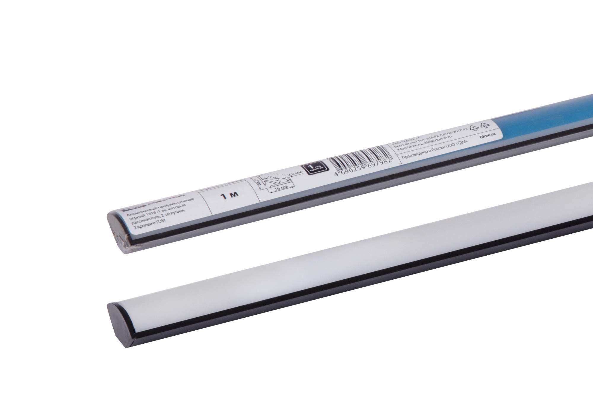 –Алюминиевый профиль угловой черный 1616 (1 м), матовый рассеиватель, 2 заглушки, 2 крепежа TDM
