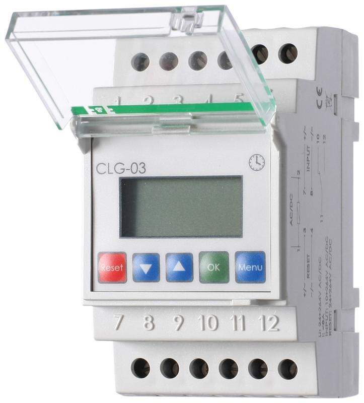Счетчик времени работы CLG-03 24-264В AC/DC 8А 1NO/NC IP20 вход сброса реле управления нагрузкой прямой счет импульсов (1-999 999) управление нагрузкой блокировка доступа PIN-кодом на DIN-рейку F&F EA16.002.001