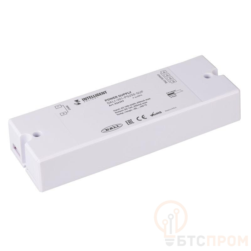 Источник питания для шины DALI. Монтаж на поверхность. Питание 100-240VAC, выход 16VDC 250mA.