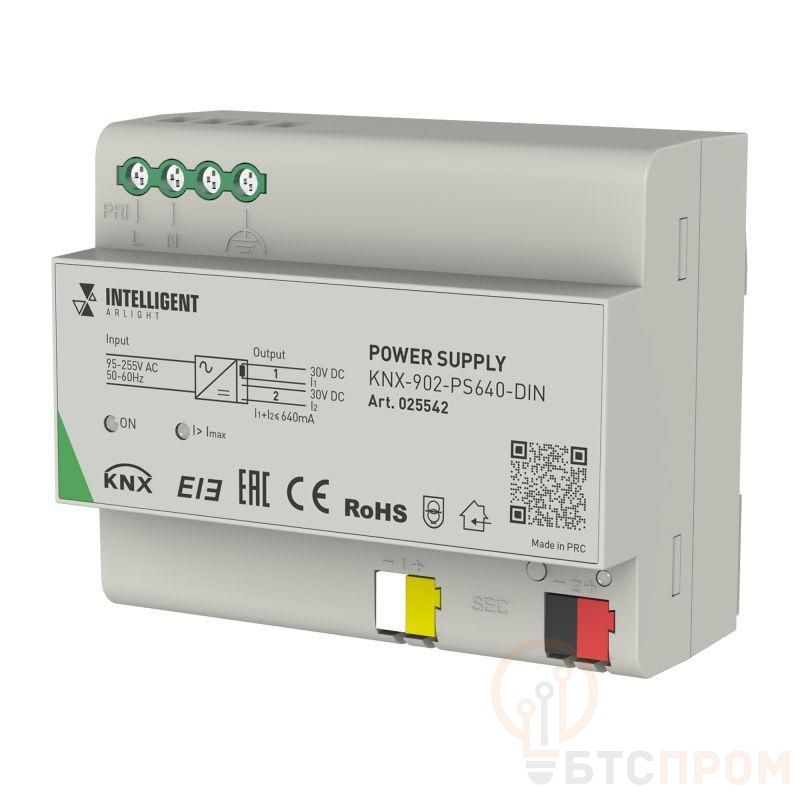 Блок питания шины KNX для установки на DIN-рейку. Напряжение питания AC 95-255 V, ток нагрузки 640 mA. Два раздельных выхода (BUS + AUX). Размер 90?108?64mm