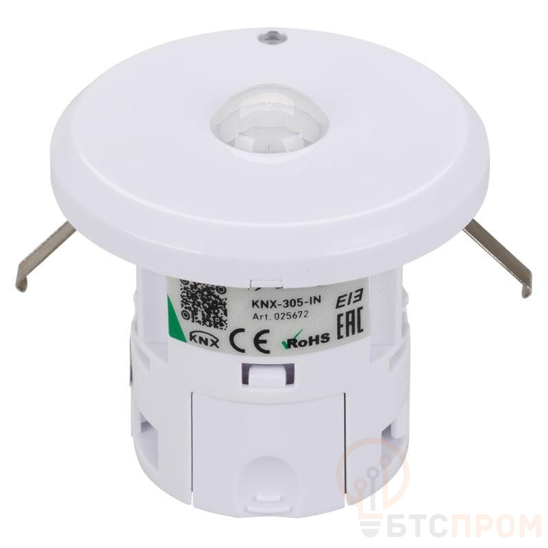 Датчик движения и освещенности для шины KNX. Установка потолочная до 4м. Радиус обнаружения движения до 8м. Напряжение питания DC 21-30V от шины данных. Наружные габариты (над поверностью монтажа) 76.2?72 мм