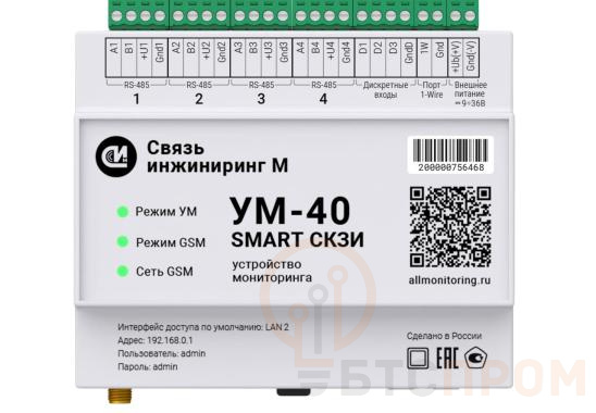 Устройство мониторинга УМ-40 SMART СКЗИ 2G/3G/LTE USB/2ETH 4RS485-IP20 (с поверкой) Связь инжиниринг М 17387